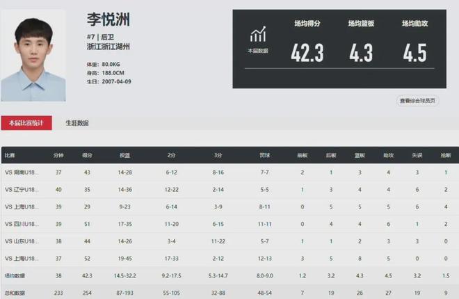 你可以说李悦洲孤胆英雄的打法不能率领浙江U18男篮拿到最好的成绩,但他的个人能力确实鹤立鸡群,但凡队友当中能有匹配强度的人,也不至于李悦洲背靠背3场球合计轰下147分。
