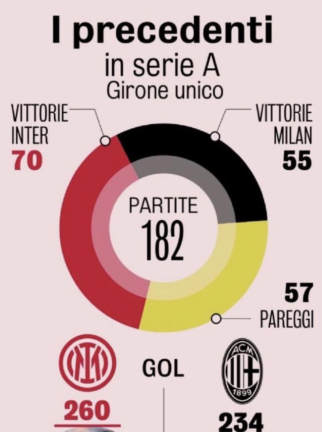 意甲交锋当中,国米70胜55负57平占优;而在双方总计244次历史交锋中,国际米兰以91胜占据上风,红黑军团则取得82场胜利,另有71次双方握手言和。