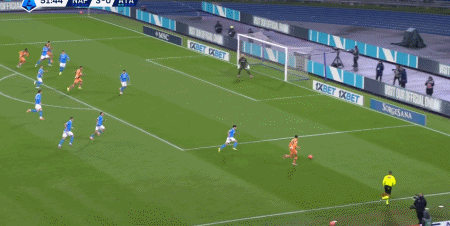 第45分钟,迪洛伦佐传中,诺阿-朗头球破门,那不勒斯3-0